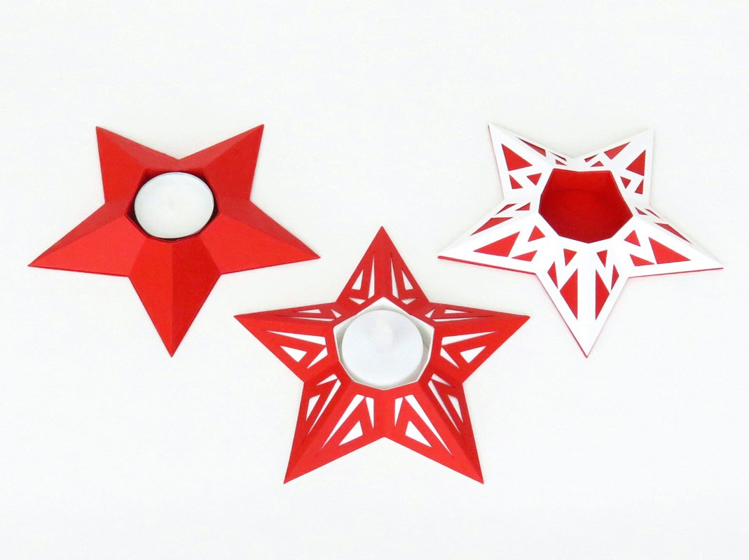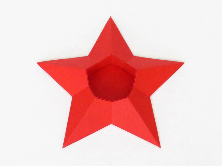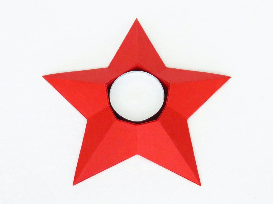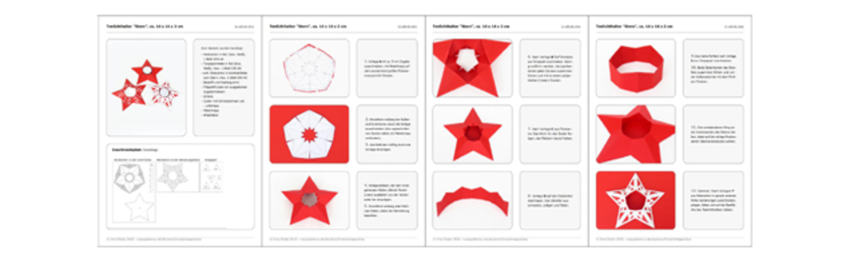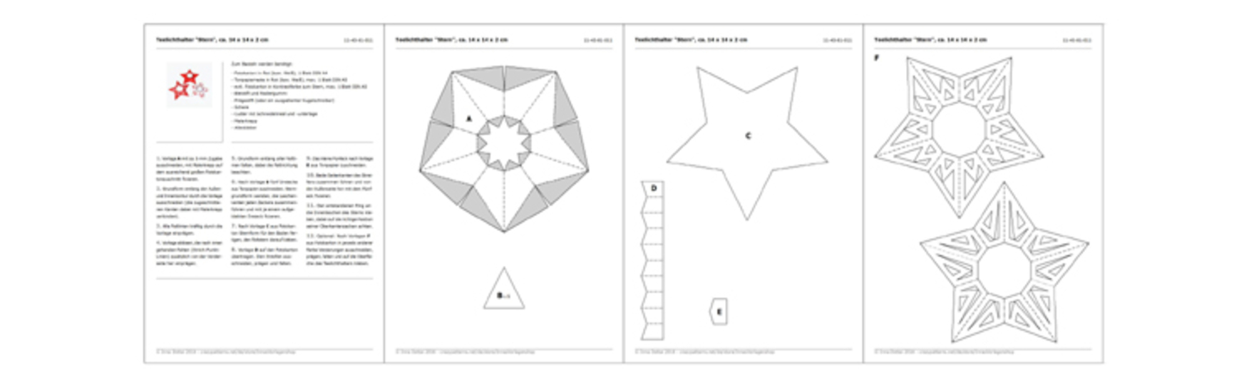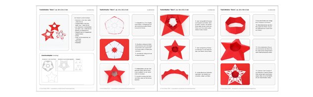 Der Stern kann aus unifarbenem, aus weihnachtlich bedrucktem oder aus Glitter-Fotokarton gebastelt werden. Du kannst den unifarbenen Stern auch, wie hier abgebildet, mit einer aus Fotokarton anderer Farbe geschnittenen Verzierung dekorieren. Vorlagen für zwei Verzierungsvarianten sind anbei.