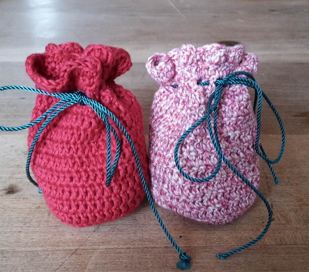 Das Material ist Baumwolle für die Nadel 2,5 oder 3. Entweder in passenden Farben, wie hier rot und rot meliert, aber auch bunt geht gut. Das einzelne Säckchen verbraucht knapp 20 g Wolle, daher gut geeignet für die Reste- Verwertung.