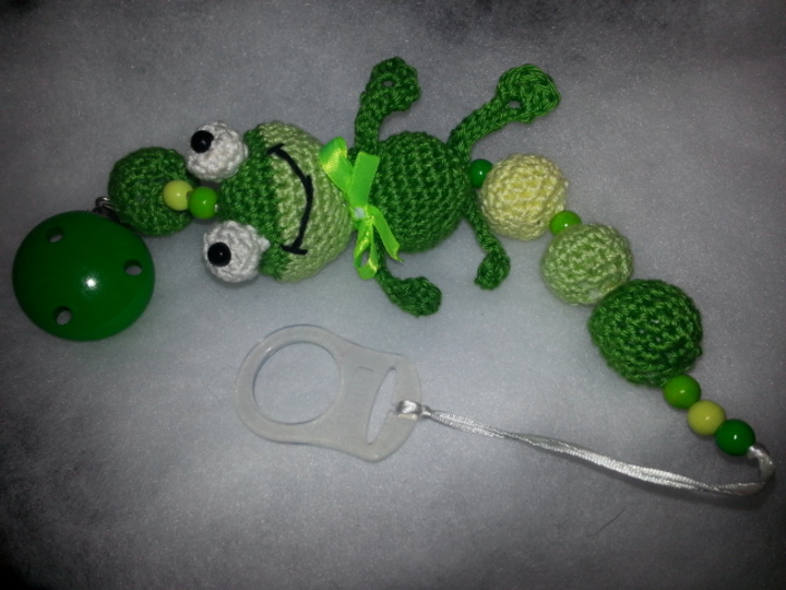 Materialliste: 100 % Baumwolle (125m/50g) in deinen Wunschfarben Schnullerkettenclip, Silikonring, Schnur, Holzperlen. Füllwatte