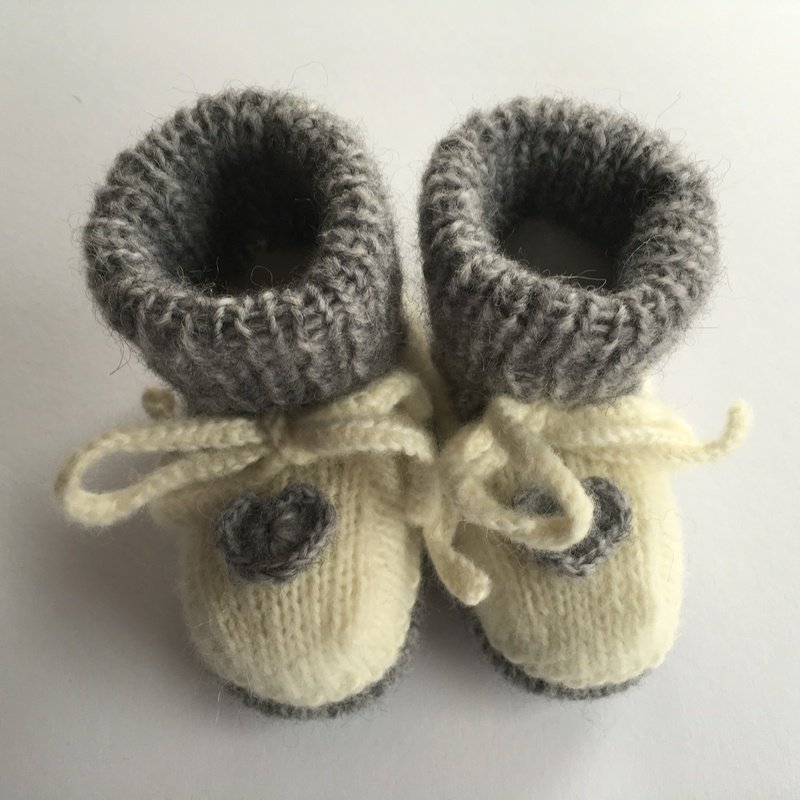Strickanleitung für kuschelig weiche und warme Babyschuhe mit gehäkelter Herzapplikation. Die Schuhe haben eine Fußlänge von ca. 10 cm.