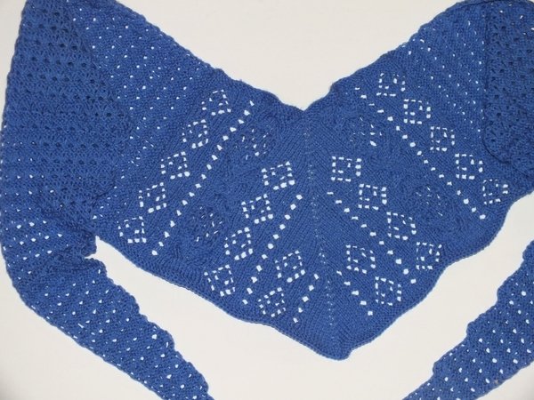 Zuerst wird der mittlere Teil des Tuches mit Lochmustern und einem kombinierten Zopf-Lochmuster gestrickt. Danach wird beidseitig jeweils ein Flügel angestrickt.