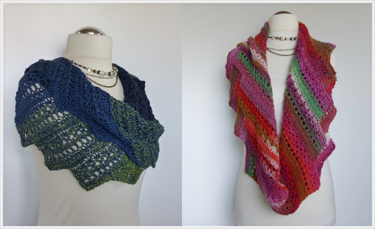 Der Loop kann mit jeder Wolle angefertigt werden. Ob filigran mit einem Lacegarn / Bobbel (grün-blauer Loop), kuscheliger Farbverlaufswolle (Pink-Bunt) oder Sockenwolle/Merino (Lila-meliert). Der Loop schaut immer gut aus.