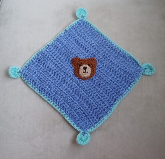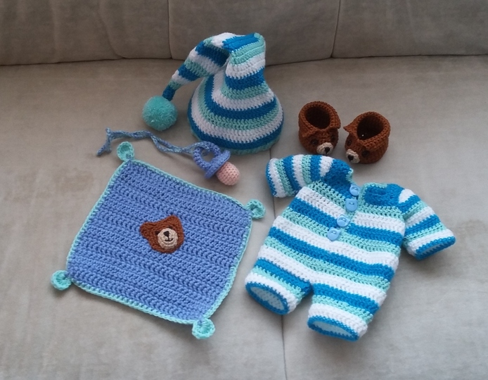Die PDF beinhaltet die Häkelanleitung für den Schlafoverall, die Bommelmütze, das Kuscheltuch, den Schnuller, sowie für die Bärchenhausschuh.
