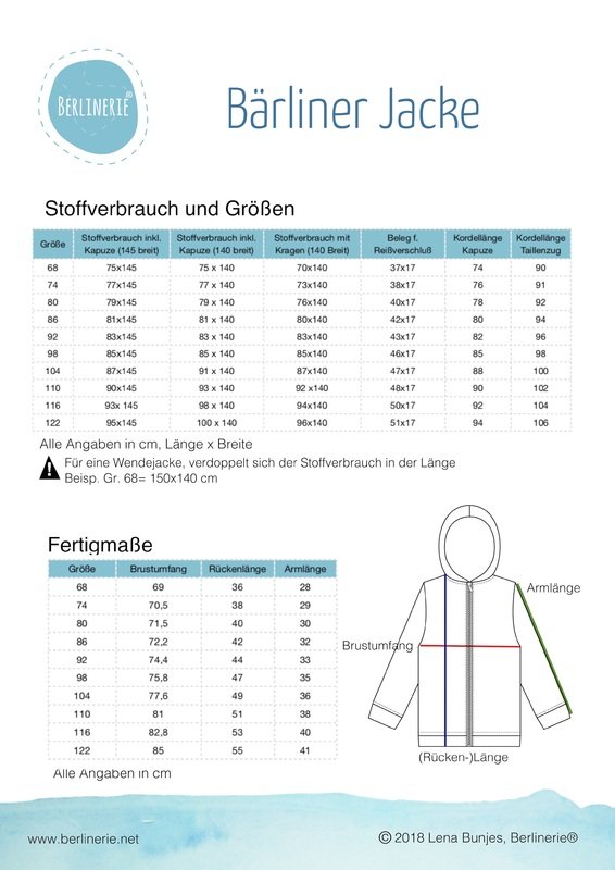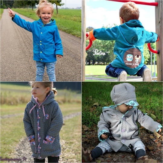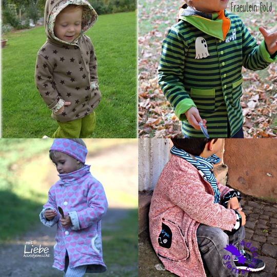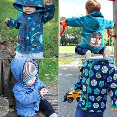 Mit diesem Ebook kannst du deinem Baby oder Kind eine gemütliche, körpernahe Übergangsjacke in den Größen 68-122 nähen. Sie ist zum Nähen mit festen, mitteldicken Stoffen gedacht und wird mit einer zweiten Stoffschicht gefüttert. Das Probenähen hat ergeben, dass sich die Jacke sehr gut auch aus zwei Baumwollstoffen, aus einer Kombi von Sweat und Jersey, Wollstoff und Jersey, leichte Jeansstoffe, Interlock oder, oder, oder nähen lässt.:-) Sie ist je nach Stoffauswahl optimal geeignet für kühle Sommerabende, frische Herbst- oder auch laue Wintertage. Die Jacke ist hüftlang und kann wahlweise mit Knopfleiste oder Reißverschluß verschlossen werden. Die einfache Grundform kann ganz leicht mit einer Kapuze, einem stylischen Kragen und/oder einem Kordelzug an der Taille erweitert werden. Die aufgesetzten Taschen gibt es in drei verschiedenen Formen und runden die Designmöglichkeiten ab.
