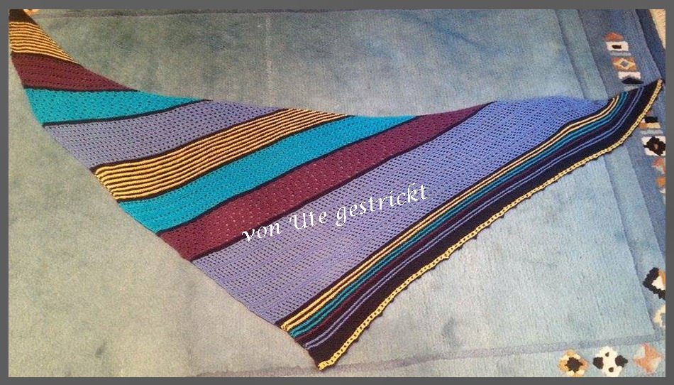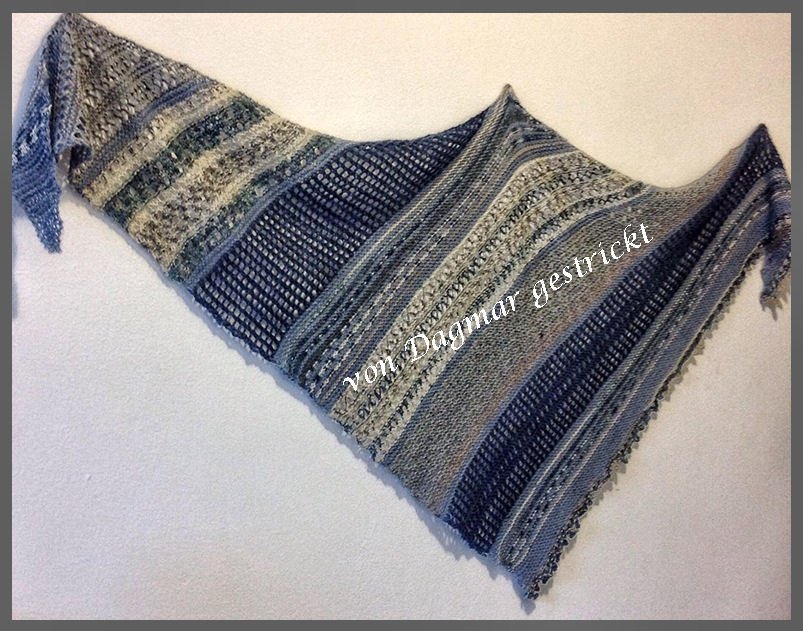 Dieses Tuch wird an der seitlichen Spitze begonnen. Ich habe die Aktiv Sockenwolle von Supergarne in fünf Farben verstrickt. Sie können sich natürlich auch für ihre Lieblingsfarben von einem Anbieter ihrer Wahl entscheiden. Bedenke sie nur, bei einer anderen Lauflänge ändert sich auch die Tuchgröße.