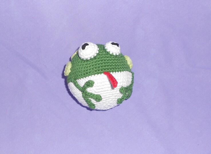 Mit Baumwollgarn 115m/50g und Nadel Nr 2,5 gearbeitet, bin ich etwas größer als ein Tennisball und liege unheimlich gut und gerne in der Hand