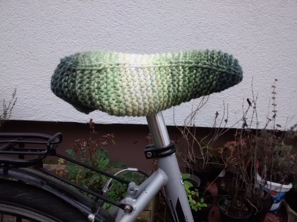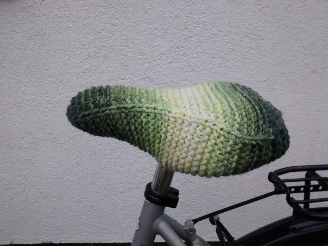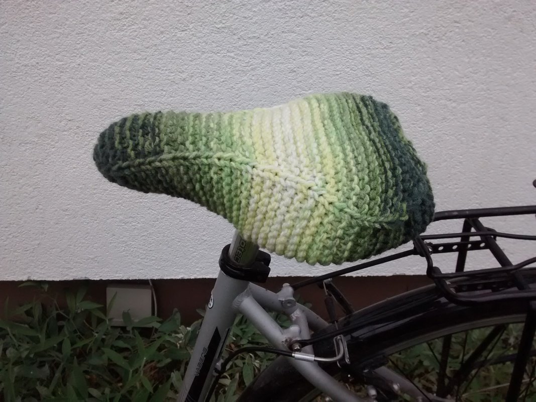 Anleitung für einen Bezug des Fahrradsattels. Es werden ca. 100g Wolle für Nadelstärke 6 und 40cm Gummiband benötigt. Wer Reste verstricken möchte kann auch gleichzeitig mehrere dünne Fäden verstricken.