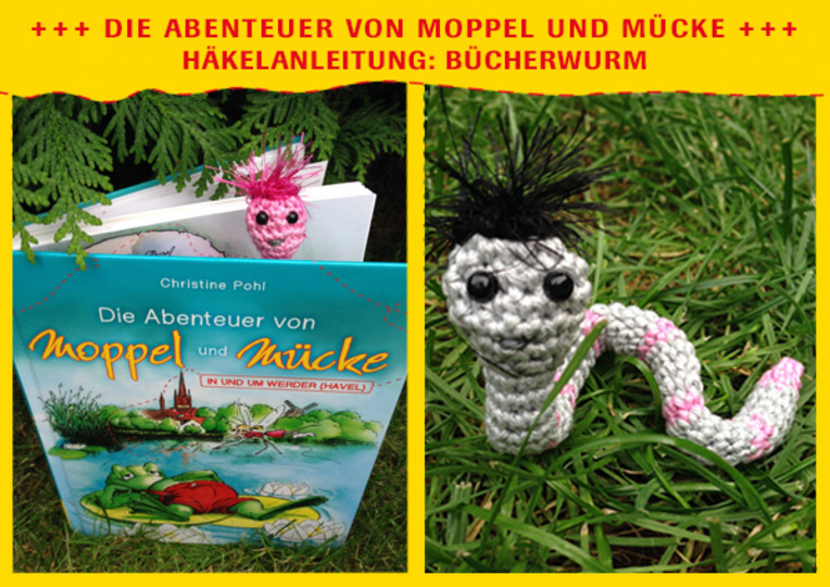 Liebe Häkelfreunde, Moppel und Mücke aus dem Kinderbuch "Die Abenteuer von Moppel & Mücke" habe ich Euch bereits vorgestellt und Ihr habt Beide schon in Eure Herzen geschlossen. Dafür danke ich Euch im Namen des gesamten so genannten MoMü-Team ganz herzlich und möchten Euch daher nun unsere Gratis-Anleitung Bücherwurm vorstellen: