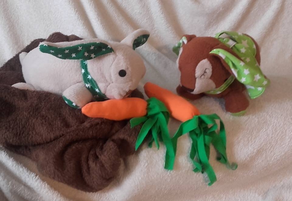 Die angegebene Stoffwahl ist nur ein Beispiel. Selbstverständlich kannst du auch andere Stoffe/ Augen verwenden. Leicht dehnbare Stoffe eignen sich gut. Ich persönlich habe bisher Plüsch, Baumwolle, Fleece