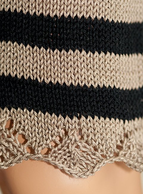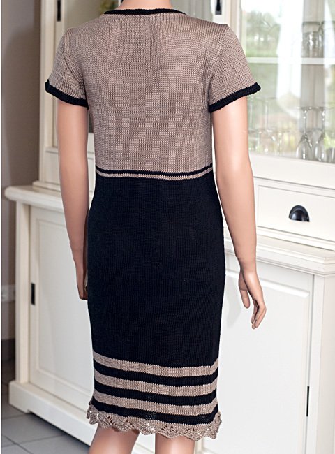 Strickanleitung für ein schönes Kleid in zwei Farben. Zunächst wird in Runden gestrickt, später teilt man das Strickstück in Vorder- und Rückenteil auf und strickt in Reihen weiter. Detaillierte Anweisungen, Fotos und Schemazeichnungen sind in der Anleitung enthalten. Die Anleitung enthält Angaben für die Größen 36/38 und 40/42.