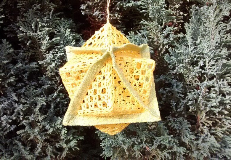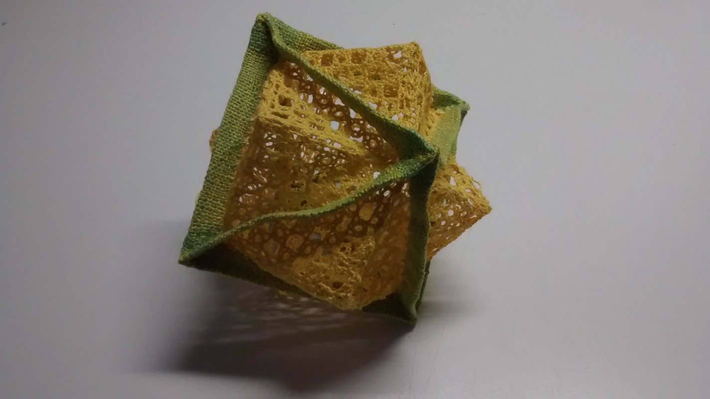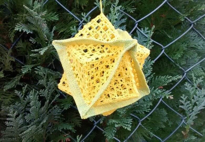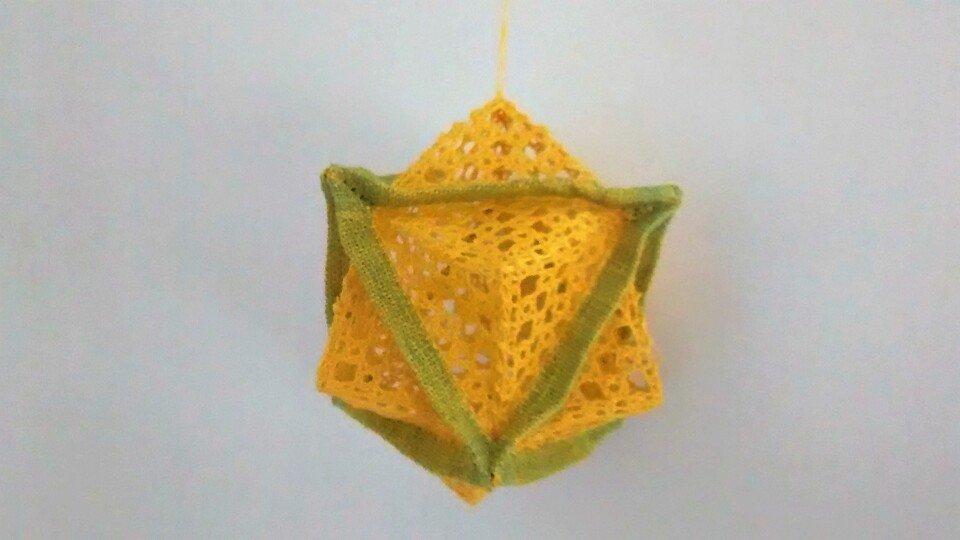 Die Anleitung ist für eine geklöppelten Kugel mit ca. 12 cm Durchmesser. Die geometrische Grundform heißt Triakisoktaeder. Die Kugel ist in einem Stück mit ungeschnittenen Fäden geklöppelt und später zusammengenäht.
