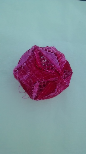 Die Anleitung ist für eine geklöppelten Kugel mit ca. 12 cm Durchmesser. Die geometrische Grundform heißt Triakisoktaeder. Die Kugel ist in einem Stück mit ungeschnittenen Fäden geklöppelt und später zusammengenäht.