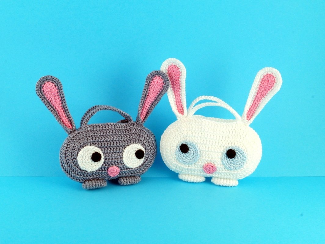 Größe: je nach Wolle, z. B., mit Wolle LL 125 m / 50 g gehäkelt, wird jede Tasche ca. 12 cm breit und 7 cm hoch (ohne Ohren).