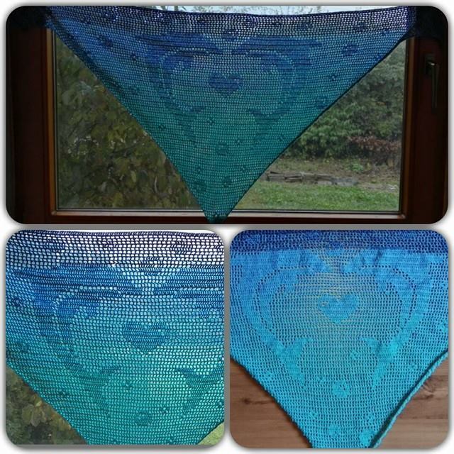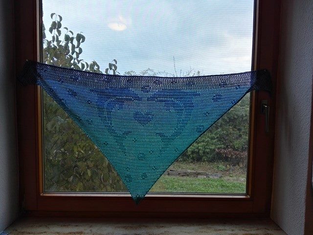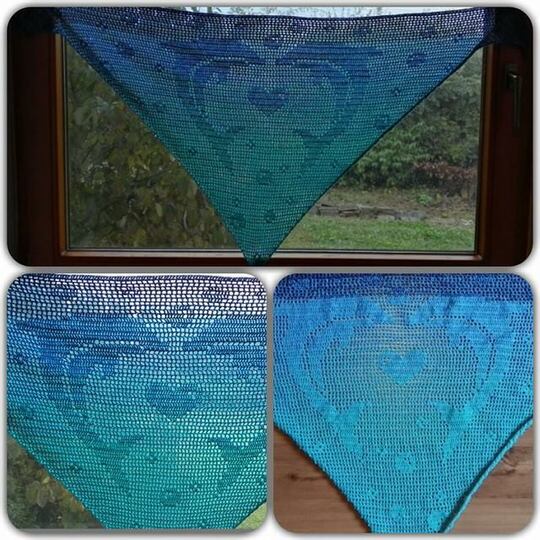 Das Tuch wurde mit ca. 1000 Metern 3- fach gefachtes Farbverlaufsgarn mit einer Nadelstärke 3 gehäkelt. Das Tuch hat folgende Masse: ca. 180 cm lang (von Ecke zu Ecke) x 80 cm breit (von Mitte zur Spitze)