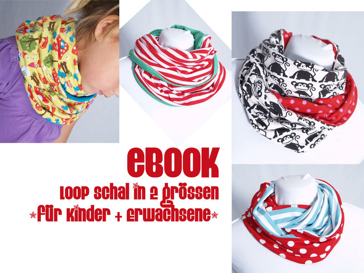 Das eBOOK enthält alle Maßangaben für 2x oder 3x geschlungene LOOP Schals aus dehnbaren (Jersey) Stoffen für Kinder und für Erwachsene.
