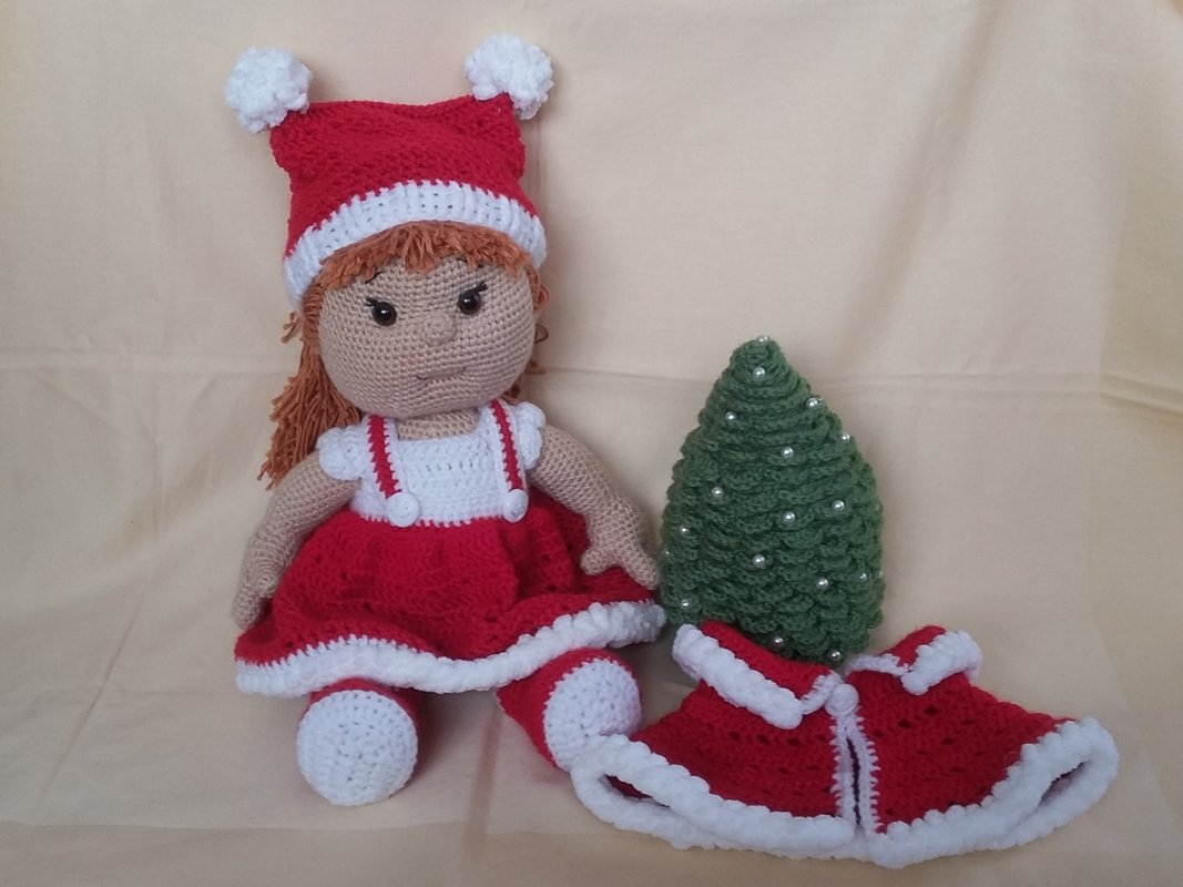 Die PDF beinhaltet die Häkelanleitung für den Rock, die Stiefel, die Bluse, das Cap sowie für die Bommel-Mütze und den Weihnachtsbaum.