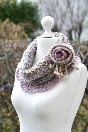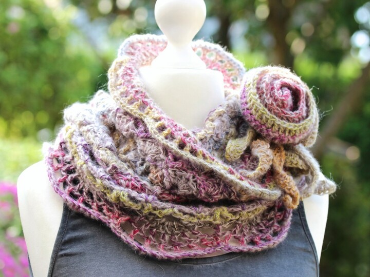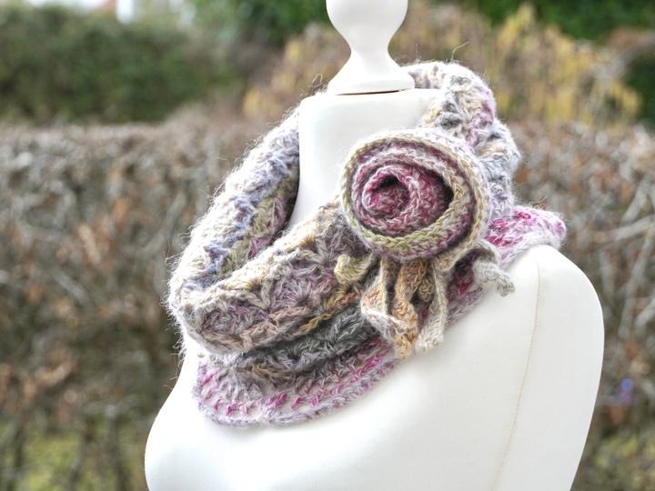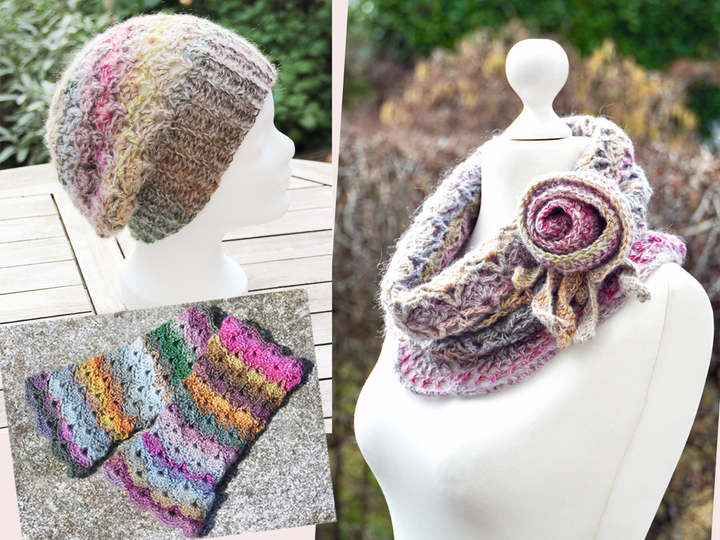 Die Häkel-Serie JORDIS, bestehend aus Loop mit Rosenbrosche, Mütze und Armstulpen im Sparset mit 20% Rabatt im Vergleich zu den Einzelpreisen.
