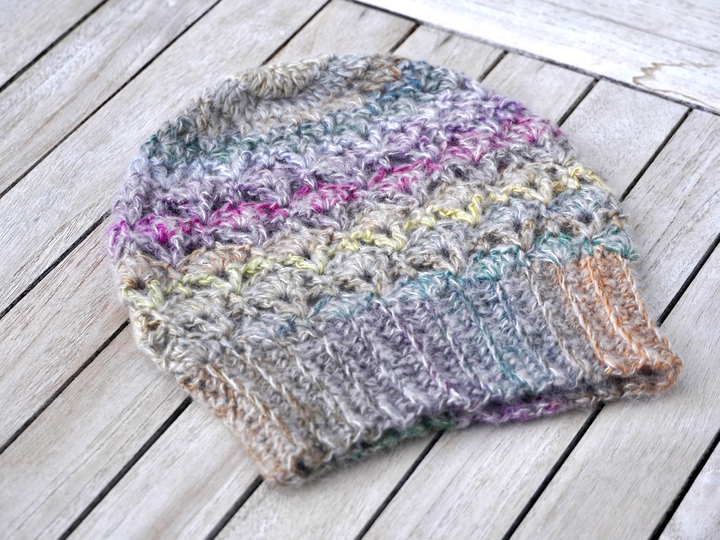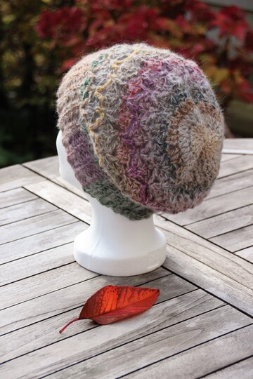 Oder alternativ: Jedes andere Garn mit kurzen Farbverläufen in ähnlicher Lauflänge (= 190 m/50 g) sowie einem flauschigen Garn (z.B. Mohairgarn) in ähnlicher Lauflänge (= 180 m/25 g).