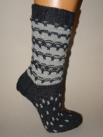 Strickanleitung für Socken im Fadenmuster in zwei Farben. Für diese Socken sollte man Übung im Sockenstricken haben, in der Runde und Muster stricken können. Die Anleitung umfasst 4 Seiten und enthält eine detailierte Beschreibung zum Stricken mit Musterbeschreibung in Worten sowie Strickschema.