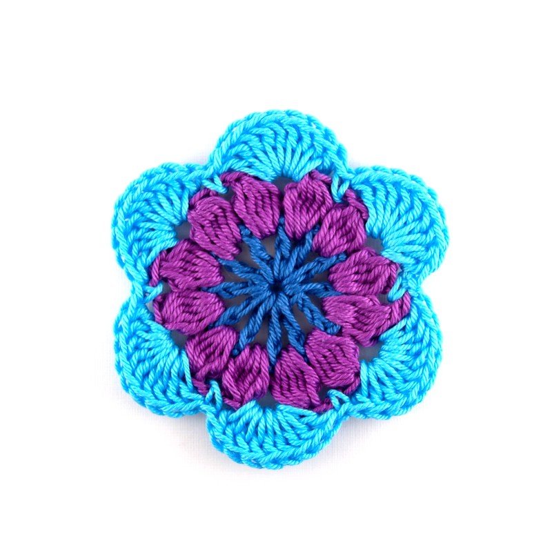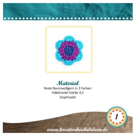 Anleitung für eine Häkelblüte als Applikation oder Deko für Geschenke, Kleidung oder Accessoires, die in farblicher Gestaltung frei individualisierbar ist. Für die Blüte benötigst du Baumwollgarn in drei verschiedenen Farben oder Farbverlaufsgarn, Häkelnadel Stäre 3,5 und eine Stopfnadel.