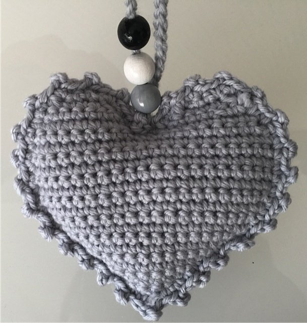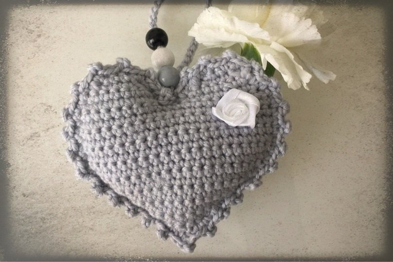 Je nach verwendeter Wolle und Häkelnadel wird das Herz zwischen 9 cm und 11 cm groß. Natürlich könnt Ihr es auch noch größer häkeln, wenn Ihr noch dickere Wolle verwendet.