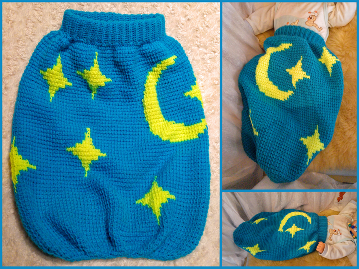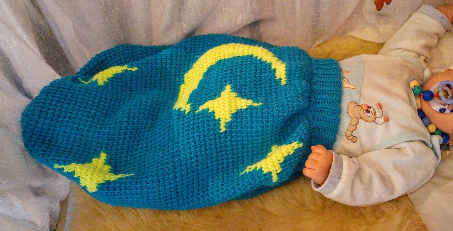 Der Pucksack wird in der Anleitung tunesisch gehäkelt. Kann aber auch normal gehäkelt werden. Es wird die tunesische Variante anschaulich mit vielen Bildern erklärt. Es wird außerdem kurz darauf eingegangen wie der Schlafsack auch normal gehäkelt werden kann.