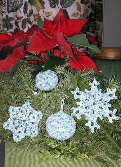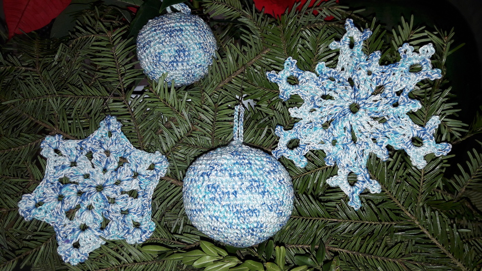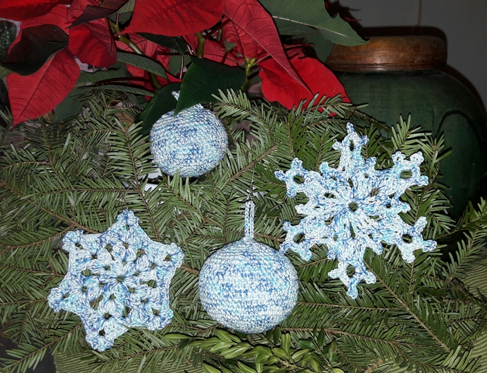 Mein Angebot beinhaltet drei Häkelanleitungen für 1 x Schneeflocke, 1 x Weihnachtsstern/Schneeflocke und eine Christbaumkugel in zwei verschiedenen Größen.