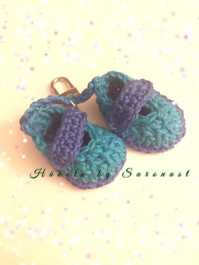 Hier erhaltet ihr eine umfangreiche und bebilderte PDF-Häkelanleitung zum häkeln kleiner Minibabyschuhe als Schlüsselanhänger.