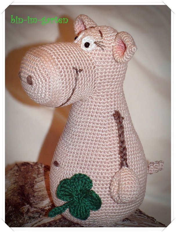 Das Schwein wird sitzend ca. 24 cm groß (mit Catania-Wolle).