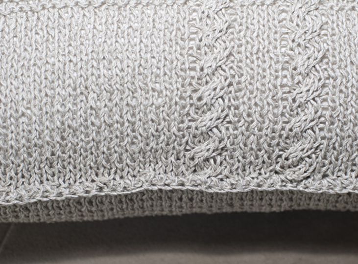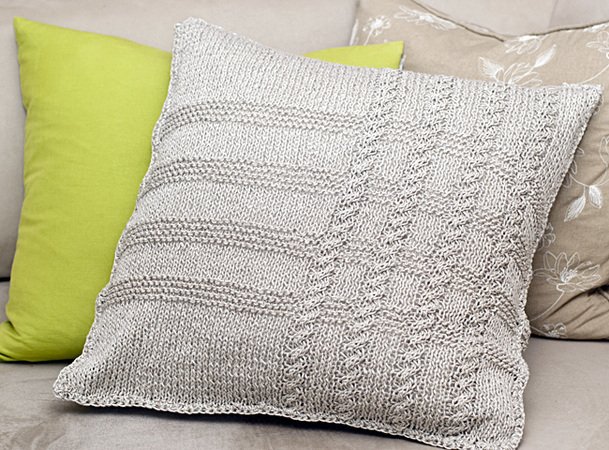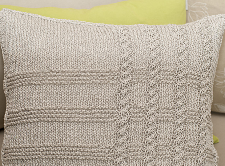 Passend für alle handelsüblichen Kissen im Format 50 x 50 cm. Hier gestrickt mit einem schönen Naturgarn aus Baumwolle und Leinen (nähere Angaben befinden sich in der Anleitung) - aber auch aus warmer Wolle gestrickt macht dieser Bezug eine tolle Figur in jedem Wohnzimmer.