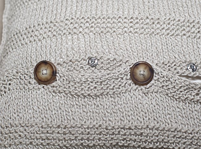 Der Bezug wird auf der Rückseite mit 5 großen Knöpfen verschlossen. Damit ein Verrutschen der Knopfleiste vermieden werden kann, sind in den Zwischenräumen zusätzlich noch Druckknöpfe angebracht.