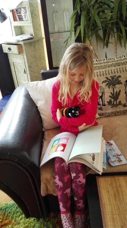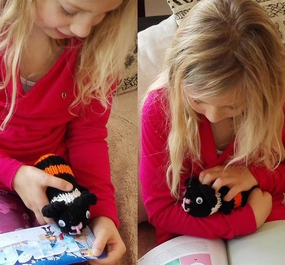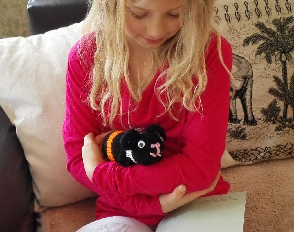 Und da nicht jeder ein echtes Meerschweinchen oder einen anderes Tier zuhause hat, habe ich den Meerschweinchenhelden „Robert“ zum Stricken nachgemacht. Und die Kinder scheinen ihn tatsächlich als Vorlesemeerschweinchen zu mögen!