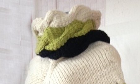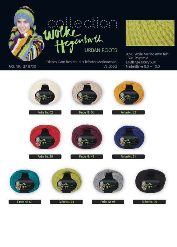 350 g Schwarz (Farbe 99), 300 g Apfelgrün (Farbe 74) und 250 g Rohweiß (Farbe 02) „Collection Wolke Hegenbarth – Urban Roots“ (97% Merino extra fine, 3 % Polyamid, LL = 60 m/50 g) von www.PRO-LANA.de