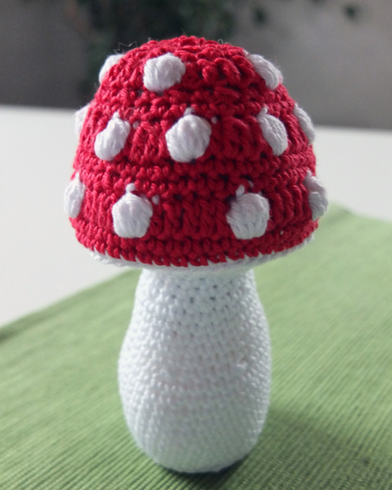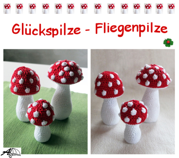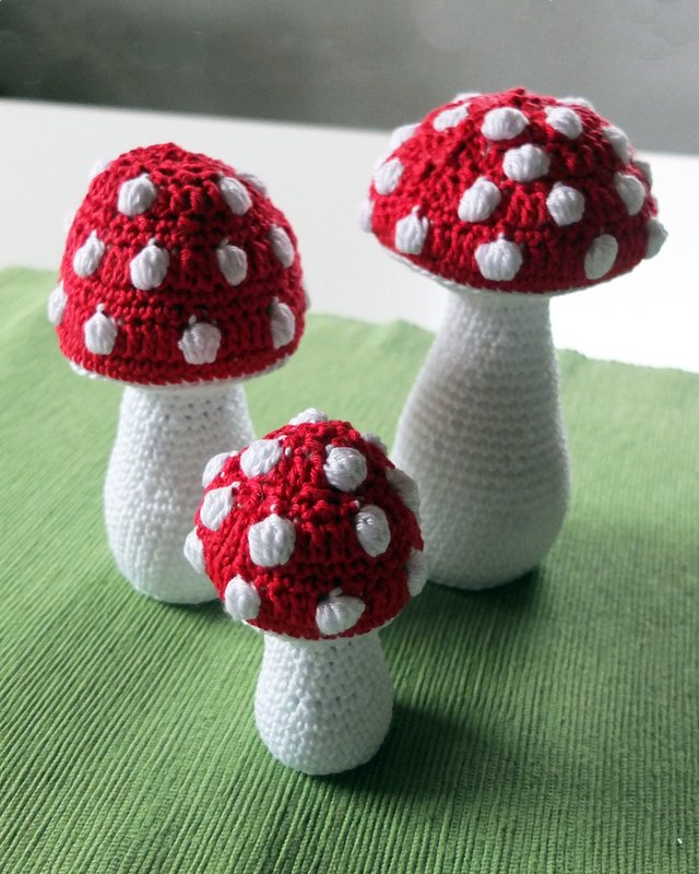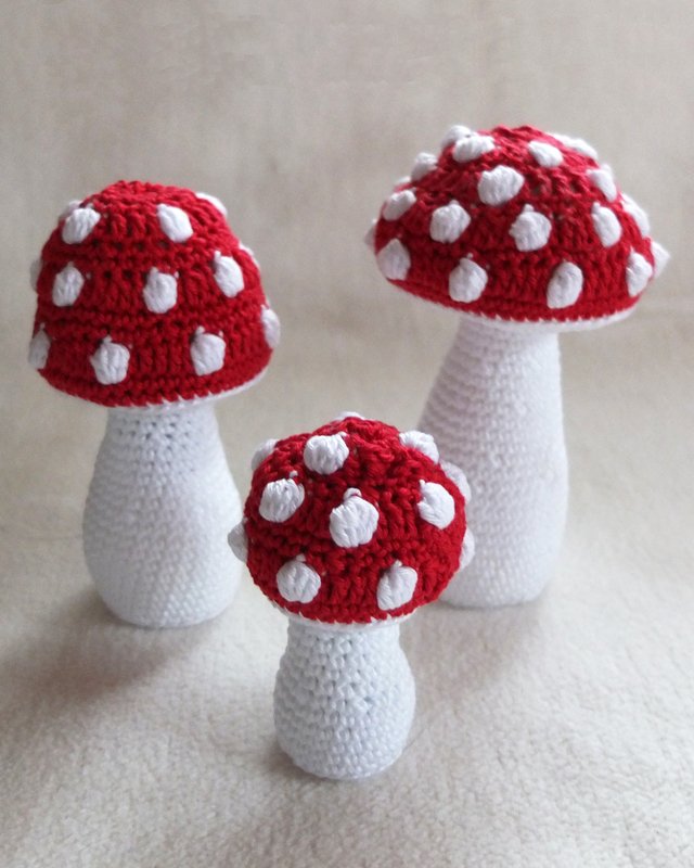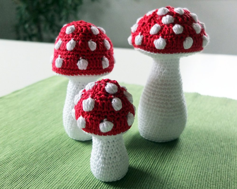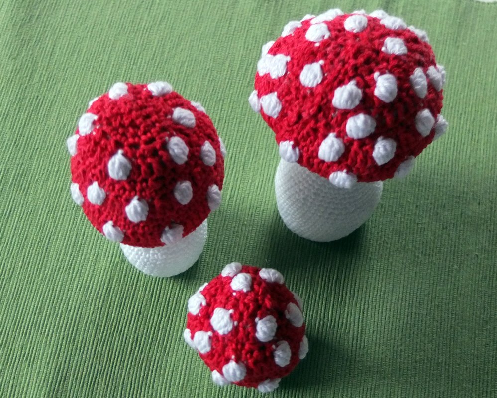 Eine Häkelanleitung für Fliegenpilze in drei verschiedenen Grössen und Formen