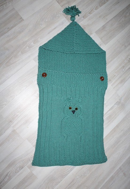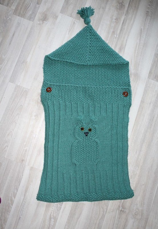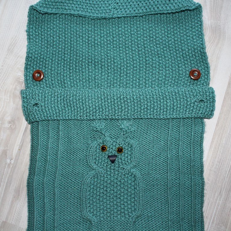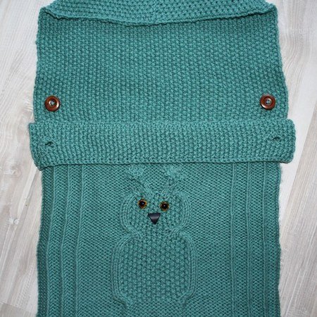 Baby-Schlafsack / Schlupfsack - ideal für die kalte Jahreszeit. Ob im Kinderwagen, im Bettchen oder in der Tragetasche - das eingestrickte Eulenmotiv ist in jedem Fall ein "Hingucker".