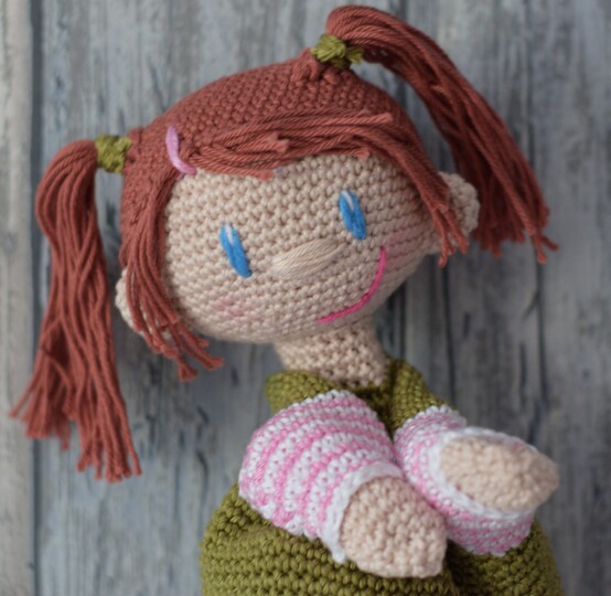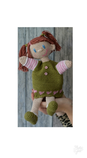 Karlotta wird mit Baumwollgarn ( LL 125/50g) und einer Häkelnadel 2,5 ca.32 cm groß.