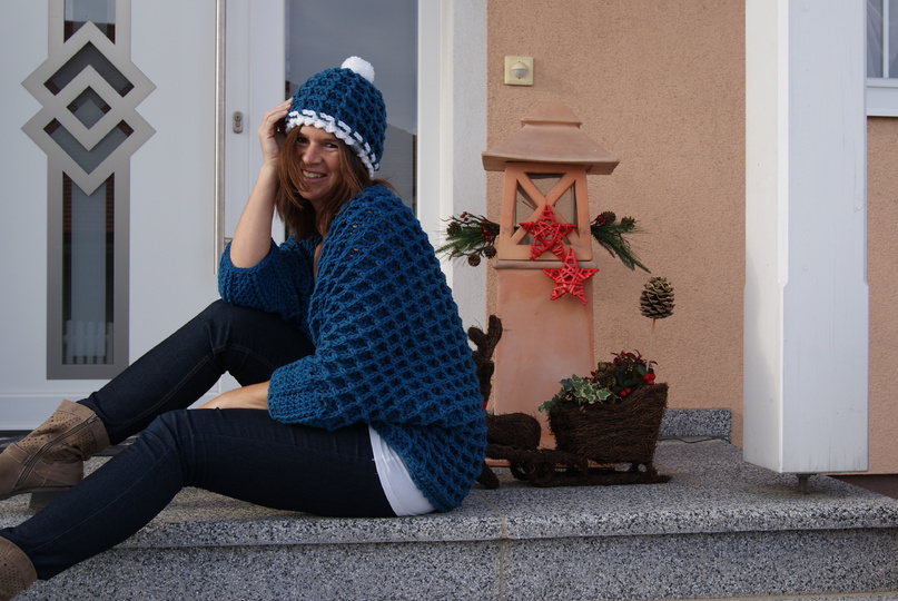 Du benötigst: Schöller & Stahl Alpha, Farbe petrol 50 g, ca. 60 lm: 2 Knäuel Alpha, Farbe weiß, 50 g, ca. 60 lm: 1 Knäuel und Häkelnadel: 8