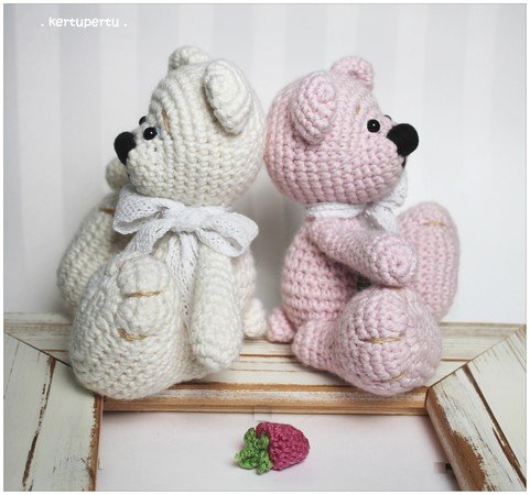 Handgemachter kleiner Himbeer Bär (rosa) und Himbeer Joghurt Bär (weiss) von Kertupertu (little teddy bear collection). Bezauberndes Spitzenband so wie Textil aus Baumwolle - diese Detaile machen das Bärchen unwiderstehlich niedlich.