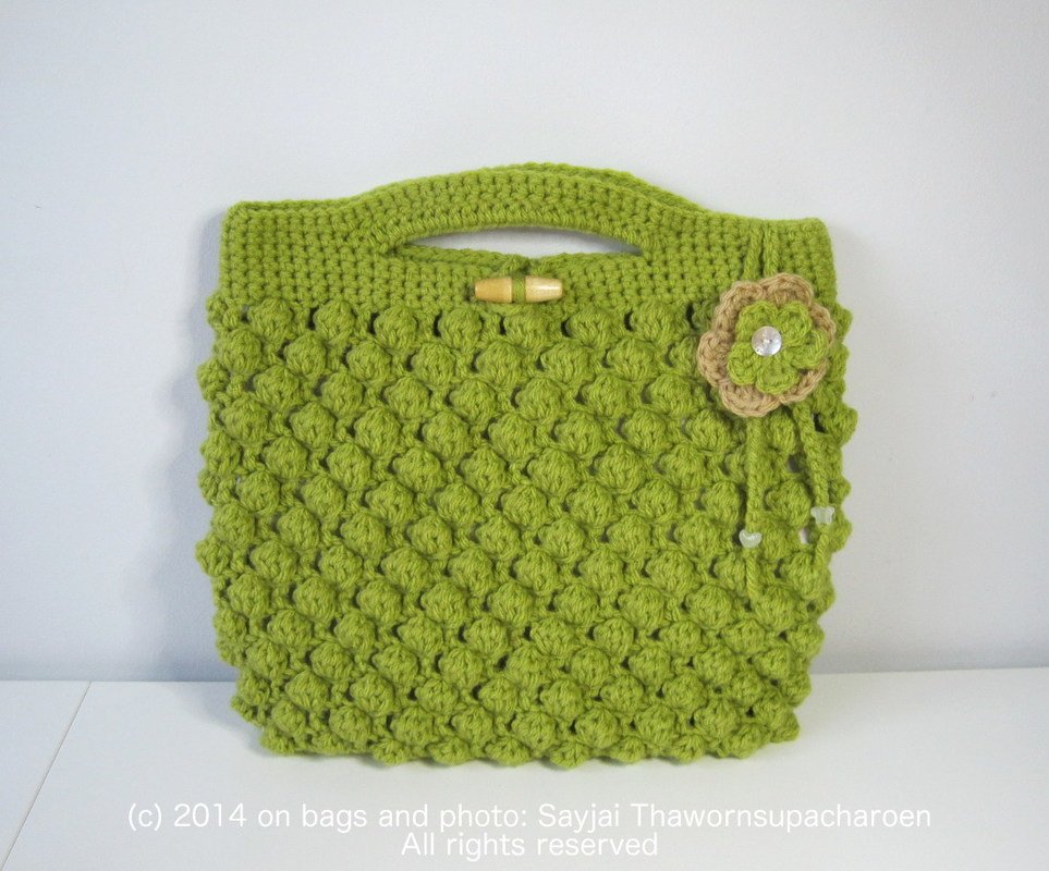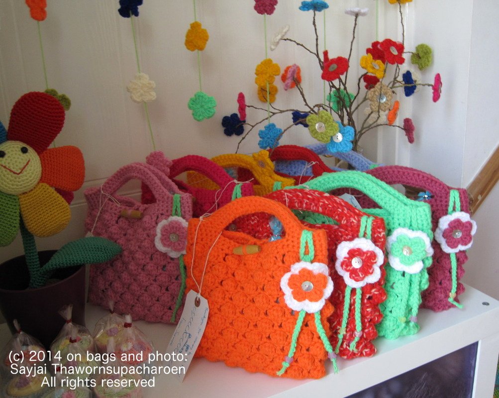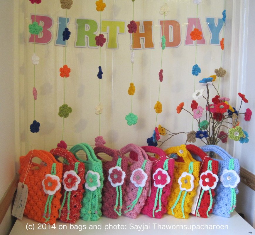 Diese kleinen und großen Noppentaschen werden aus dickem Garn (Garnkategorie 5) unter Verwendung einer Häkelnadel der Stärke 6 gearbeitet. Eine kleine Noppentasche konnte ich in zwei bis drei Stunden herstellen. Sie wurden gemacht für die Geburtstagsparty meiner Tochter, als Geschenkebeutel für ihre Freunde.