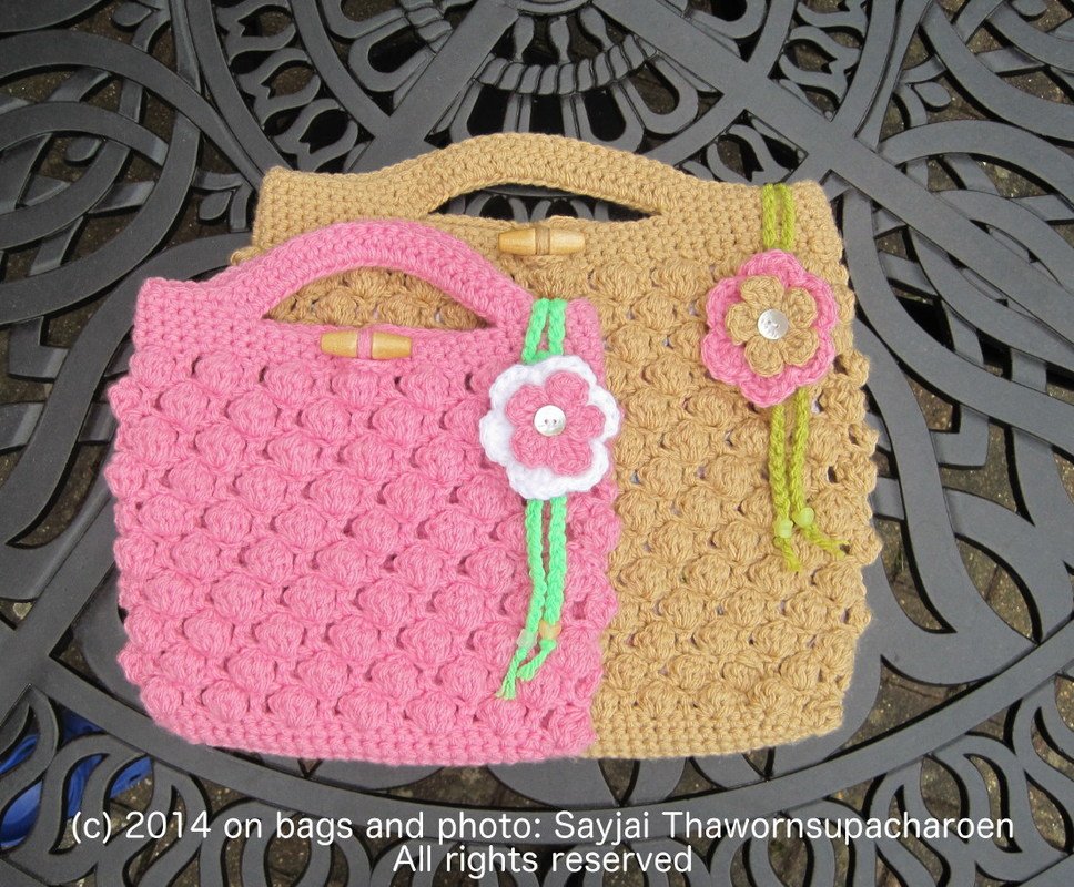 Diese Anleitung beinhaltet die Herstellung der kleinen und der großen Tasche, sowie der Blumendekoration für die Taschen. Gearbeitet wird in festen Maschen, halben Stäbchen, Stäbchen und Noppen ( wie man Noppen arbeitet, wird in der Anleitung erklärt).