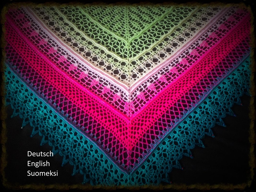 Ein mustermix Dreieckstuch mit grossem Effekt. Das Wort Edlothia kommt aus dem Sindarin und bdeutet : (er)blühen. Die Anleitung ist ausgeschrieben und mit Häkelschrift. Der Garnverbrauch für das Tuch liegt je nach Material und Nadelstärke zwischen ca 900-1100m. Für die Tücher im Beispiel hatte ich 3 fädiges Hochbauschacryl mit je 1000m Lauflänge und Nadelstärke 3,5