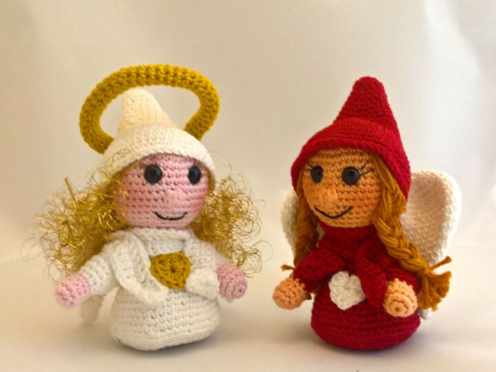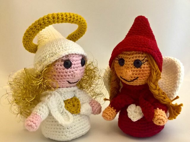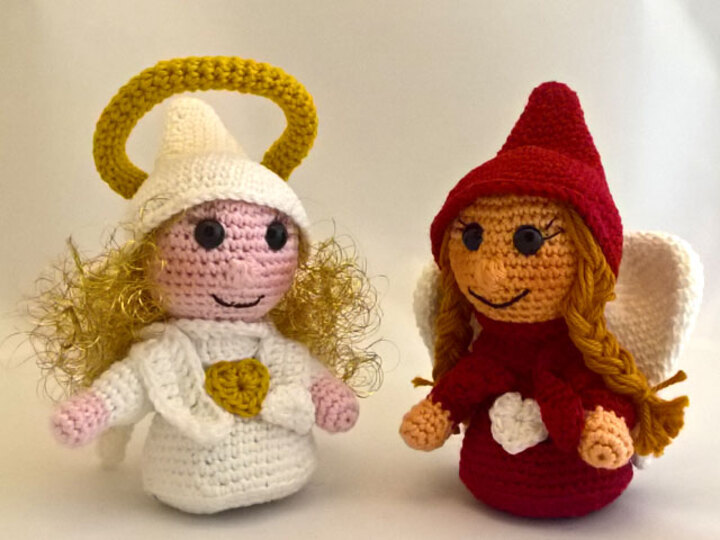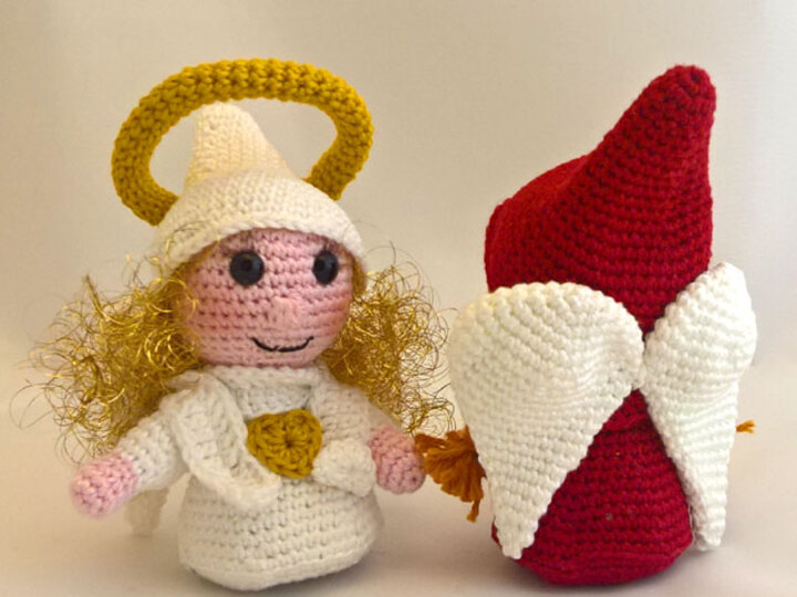 Die Figuren werden mit Baumwollgarn 50g/125lm und Nadelstärke Nr. 2 gehäkelt. Sie sind bis zur Mützenspitze ca. 12 cm hoch.