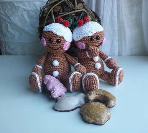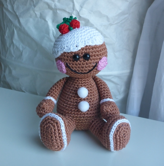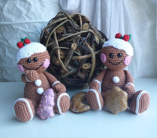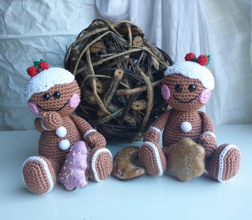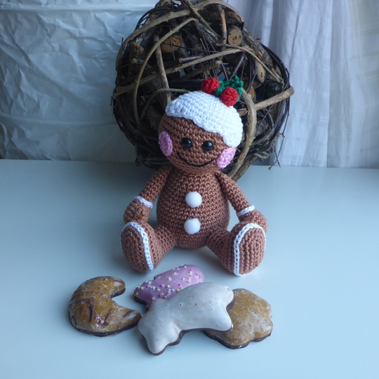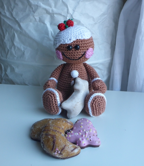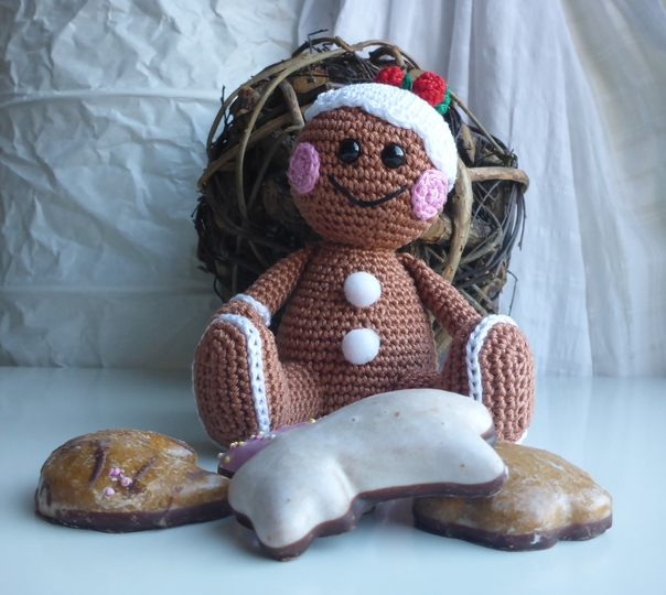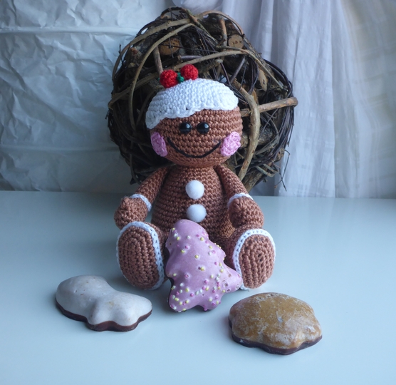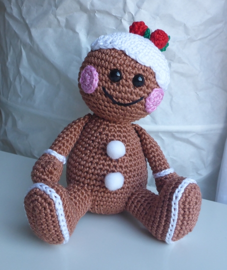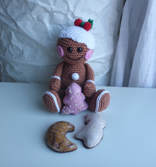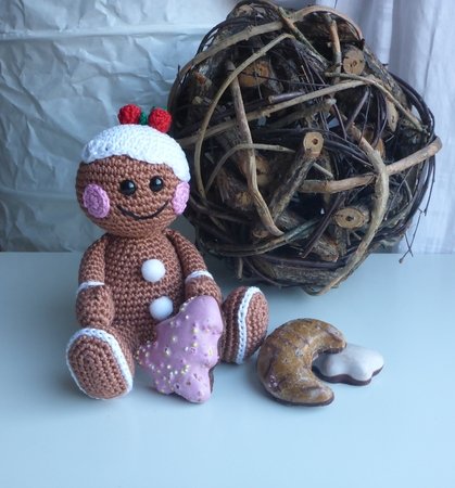 Angeboten wird eine ausführliche und gut bebilderte Häkelanleitung für das Lebkuchenmännchen, nicht der fertige Lebkuchenmann. Die Anleitung umfaßt 12 Seiten.