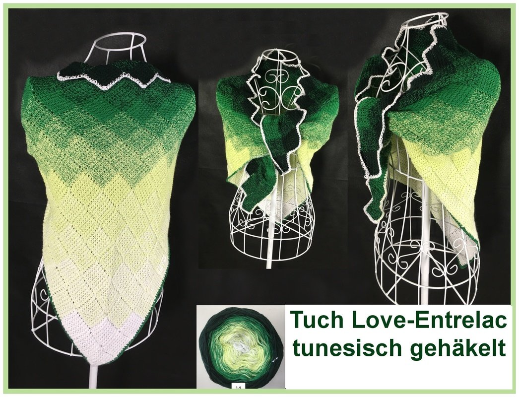 Ein Hauch von Luxus bietet dieses zarte Tuch nach Fertigstellung. Das dünne Garn erfordert etwas Geduld, aber die Mühle lohnt sich auf jeden Fall. Im Entrelac-Stil werden Quadratreihe für Quadratreihe nacheinander im tunesischen Grundmuster fertig gestellt und lassen so keine Langeweile aufkommen.
