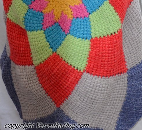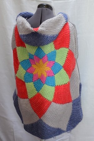 Wenn ihr das Modell aus der Woolly Hugs BANDY arbeitet – benötigt man für die Weste: 6 Knäuel – 600 g für eine Jacke mit 3/4 Arm bzw. mit Langarm: 8 Knäuel – 800 g und eine tunesische Häkelnadel mit kurzem Seil (40 – 60 cm) Nr. 7 – 8. Je nachdem wie fest ihr arbeitet. Im tunesischen Grundmuster muss man auf eine Maschenprobe von 14 Maschen und 12 Reihen kommen (mit der BANDY!) Die Jacke Woolly Hugs SHEEP fällt größer aus – sie passt von Größe 42 – 48. Im tunesischen Grundmuster muss man auf eine Maschenprobe von 12 Maschen und 10,5 Reihen kommen (mit der SHEEP!) Die Jacke hat am Rücken eine Länge von 90 cm vom Kragen bis zur unteren Kante der Blende. Hier kann man die Farben natürlich beliebig austauschen. je 1 Knäuel – 50 g Gelb, Pink, Türkis und Limone 2 Knäuel – 100 g Knäuel Rot 3 Knäuel – 150 g Knäuel Grau und als Weste 6 Knäuel – 300 g Blau zusätzlich für die Arme bei einem 3/4 Arm: 3 Knäuel – 150 g Blau, für eine Langarm-Jacke 4 Knäuel – 200 g Blau. Info: wer sich 1 Farbe sparen möchte kann für den innersten Kreis und den 3. Kreis die gleiche Farbe verwenden – hier reicht dann insgesamt 1 Knäuel – 50 g