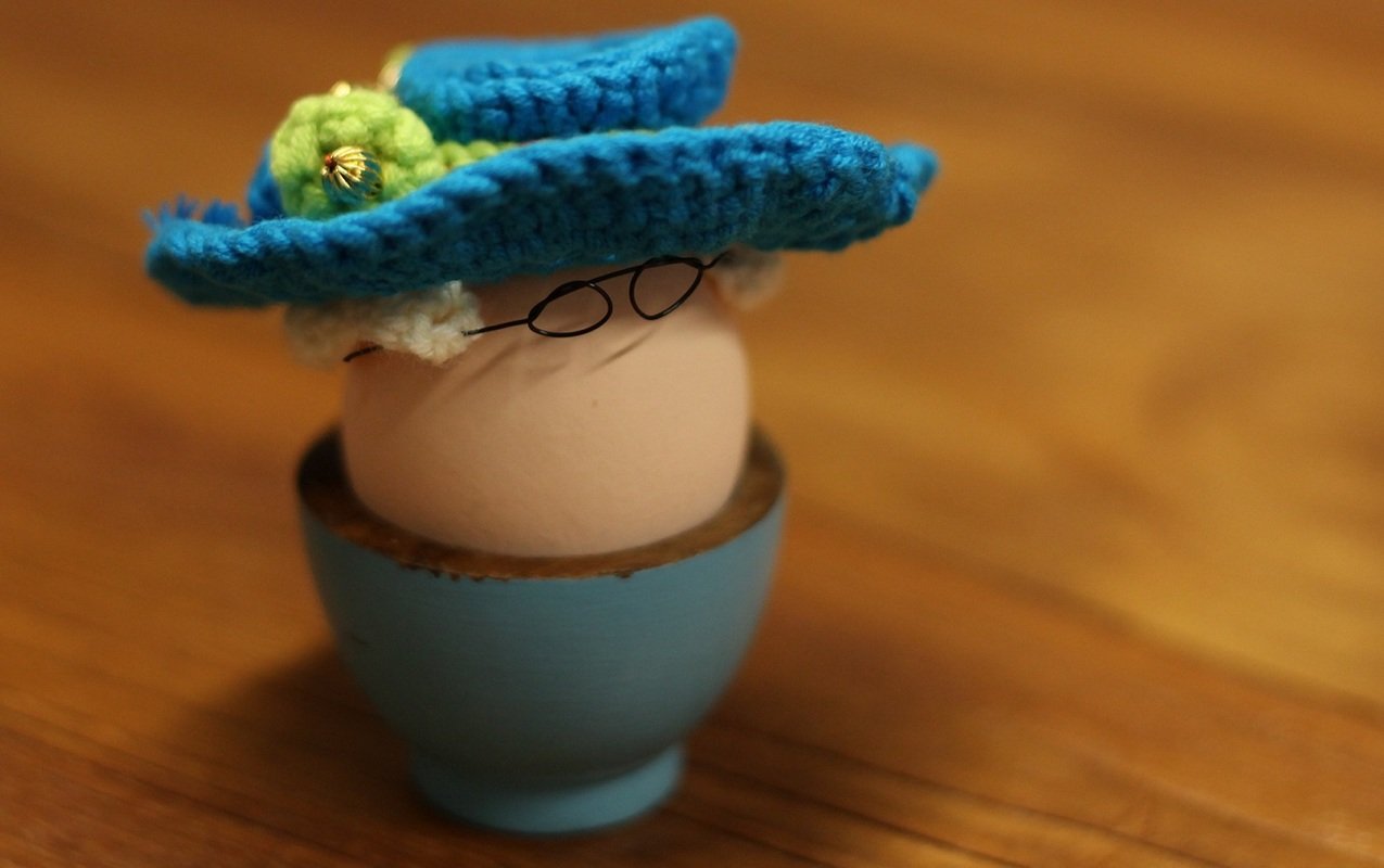 Gehäkelte Eierwärmer Queen Mum - gehäkelt in den Quietschefarben der Lady aus Wollresten.