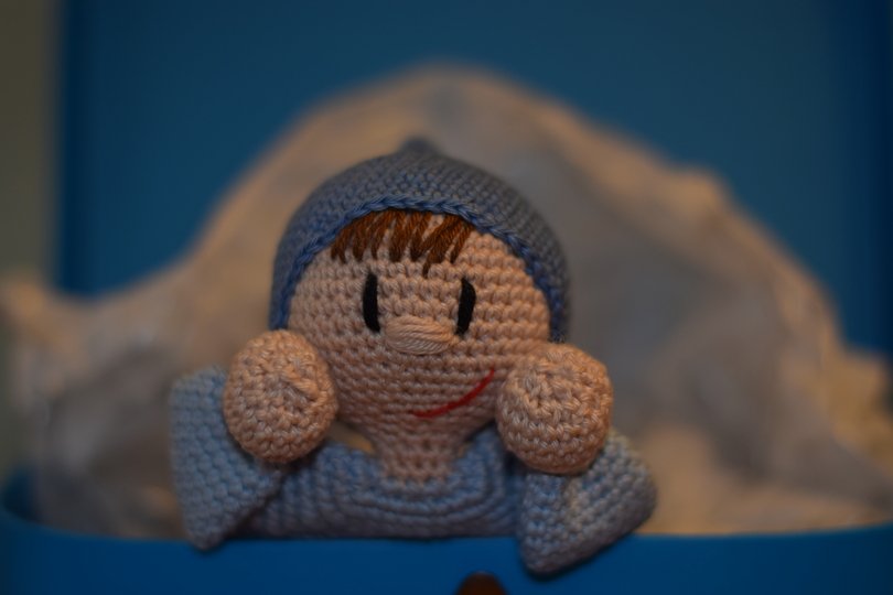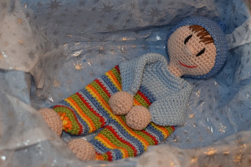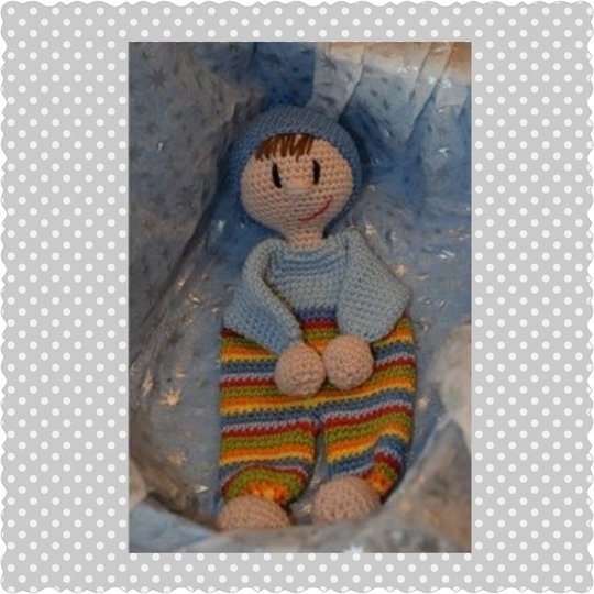 Er wird an einem Stück gehäkelt, das Gesicht ist gestickt, lediglich die Mütze wird angenäht.