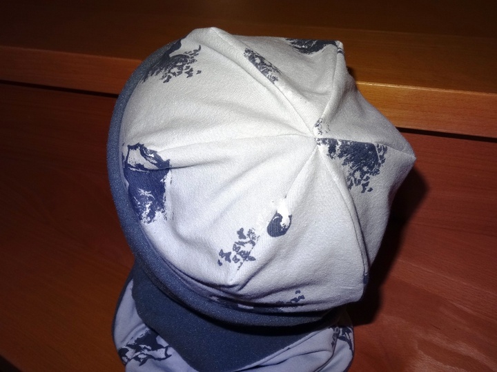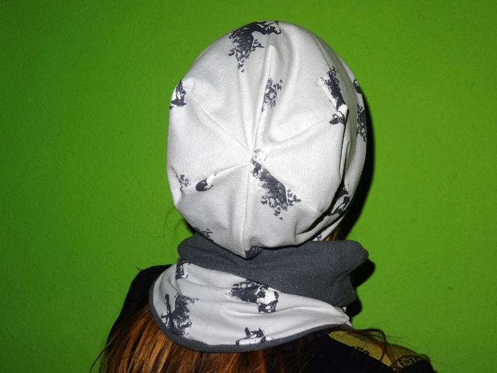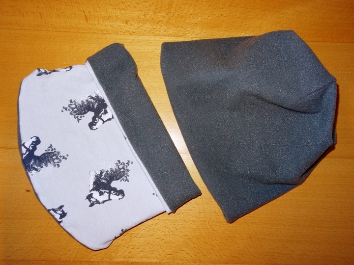 Das Set wurde mehrfach probegenäht, da es eine Beanie ist fällt sie hinten und liegt nicht am Kopf an, wenn sie am Kopf anliegen soll muss die Mütze einmal umgeschlagen werden