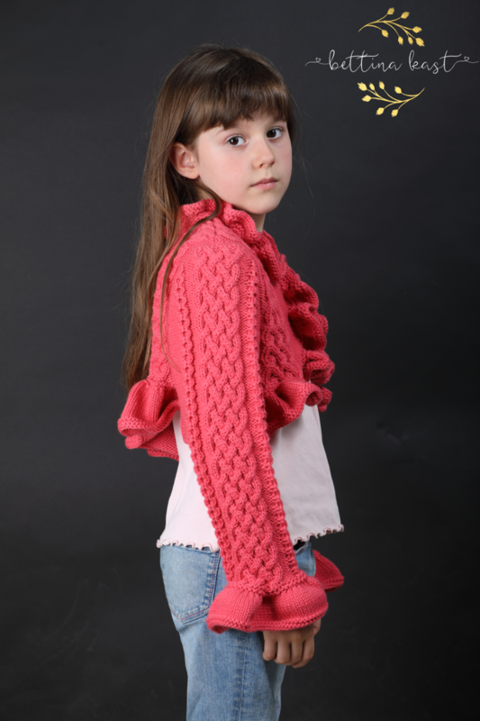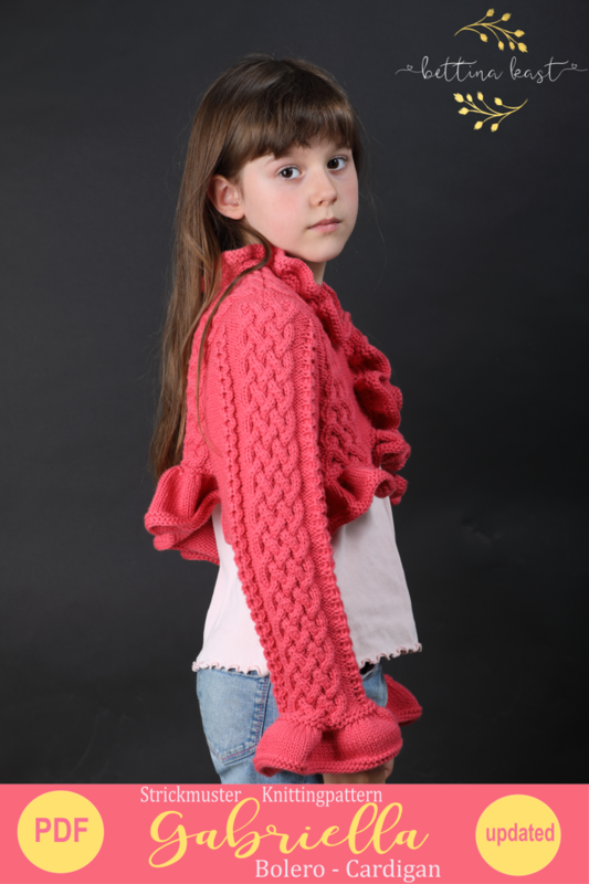 Gabriella ist ein wunderschöner Bolero / eine kurze Strickjacke, die über und über mit unterschiedlichen Zopfmustern dekoriert ist. Unheimlich romantisch und extravagant mit den Volants, insbesondere mit dem langen Volant im Rückenteil.
