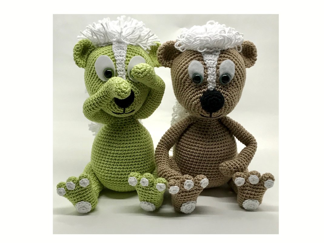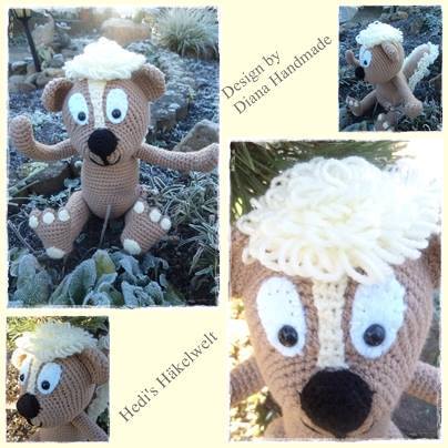 Material: Baumwolle der Stärke 3-3,5 50g =125 m ca. 60 g hellbraun, 50 g weiss,10 g schwarz, Sicherheitsaugen 12 mm, Bastelfilz in weiss, 3 Pfeifenputzer, Stopfwatte, Maschenmarkierer oder einen farbigen Faden, Häkelnadel 2.5, Wollnadel zum annähen.